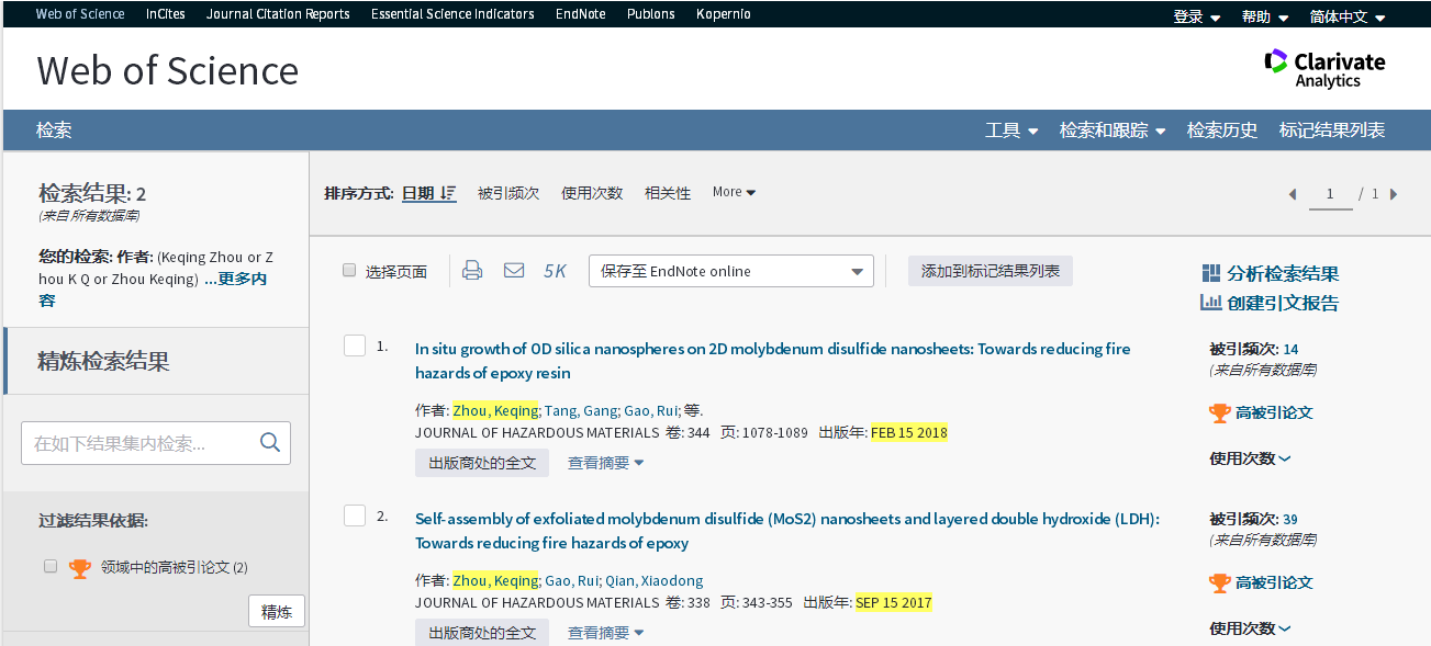 基本科学指标数据库(Essential Science Indicators,简称ESI)最新数据显示,安全工程系周克清老师发表的论文“In situ growth of 0D silica nanospheres on 2D molybdenum disulfide nanosheets: Towards reducing fire hazards of epoxy resin”入选高被引论文。该论文是周克清老师以beat365在线唯一官网为第一单位、第一作者和通讯作者身份发表的第2篇ESI高被引论文。2018年7月周克清老师发表的论文“Self-assembly of exfoliated molybdenum disulfide (MoS2) nanosheets and layered double hydroxide (LDH): Towards reducing fire hazards of epoxy”曾同时入选ESI高被引论文和热点论文。