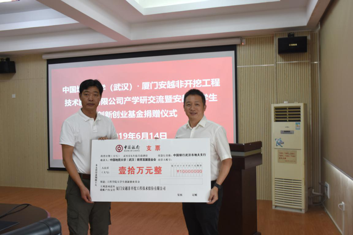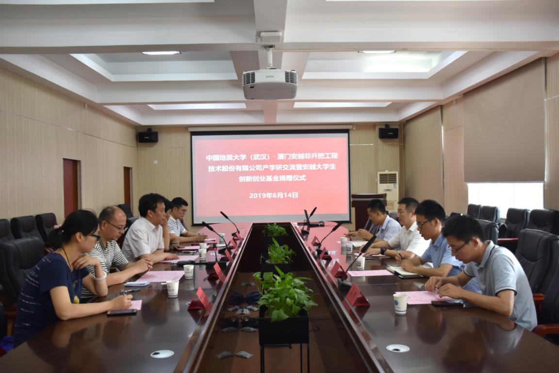2019年6月14日上午,厦门安越非开挖技术股份有限公司来校作产学研交流,并捐赠10万设立安越大学生创新创业基金,捐赠仪式在315举行。厦门安越非开挖技术股份有限公司董事长廖宝勇一行、武汉中地大非开挖研究院有限公司总经理孔耀祖,校友工作与教育基金管理处副处长吕占峰、丁苗苗,beat365在线唯一官网党委书记陈飞、党委副书记江广长、副教授曾聪参加会议。江广长主持会议。