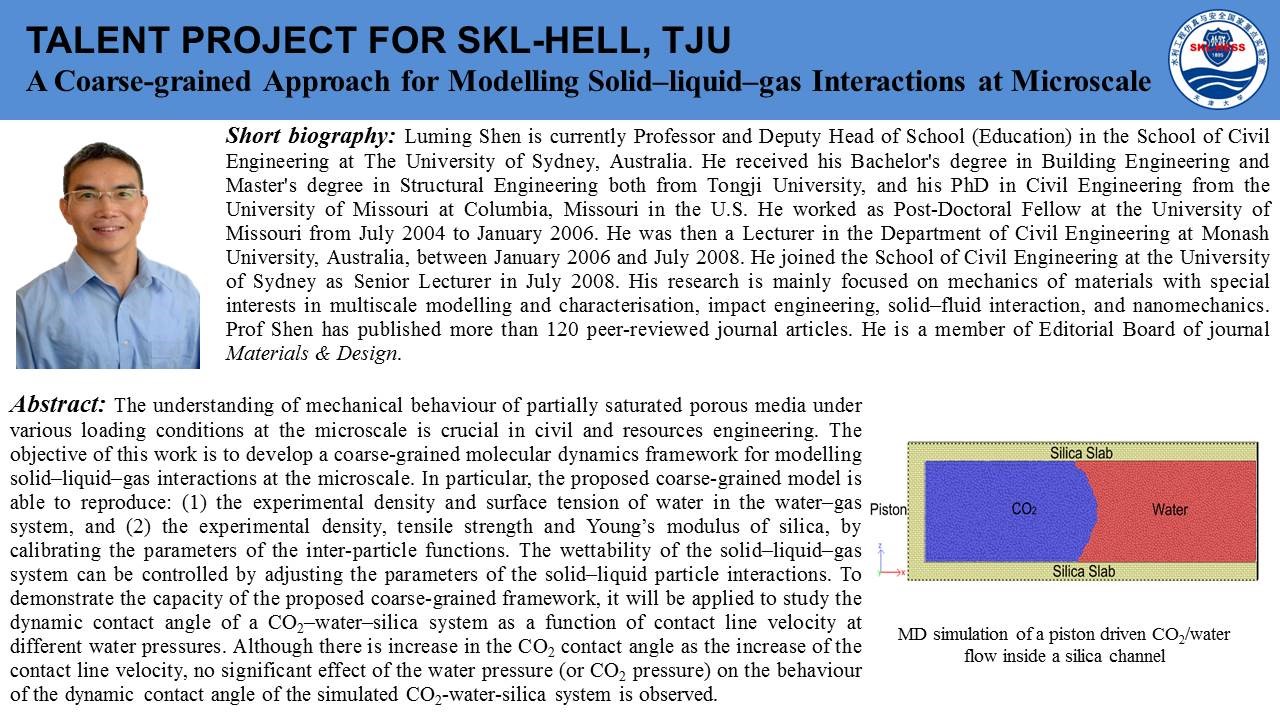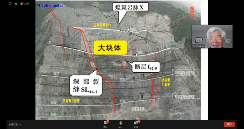 beat365在线唯一官网院长焦玉勇教授作为国际岩石力学与岩石工程学会非连续变形分析专委会主席牵头组织并主持了此次云论坛会议,石根华教授基于数十年的关键块体理论研究工作,介绍了关键块体理论的发展、基本原理及采用赤平投影方法将2D关键块体理论拓展的3D关键块体理论,并且用多个实际工程演示了关键块体理论的坝基、硐室分析应用;赵坚教授以岩石动力学实验及实验设备为出发点,简述了霍普金森杆(SHPB)在高加载率动力学实验中的应用和真三轴SHPB的发展过程及其特性与应用领域;沈鲁明教授以气-液-固一体化微观数值计算方法为核心,介绍了CGMD(coarse-grained molecular dynamic)数值方法,详细阐述了CGMD中多相相互作用关系,并以数值实验对CGMD进行验证,最后介绍了CGMD方法模拟CO2-水-SiO2系统各相介质之间的相互作用。