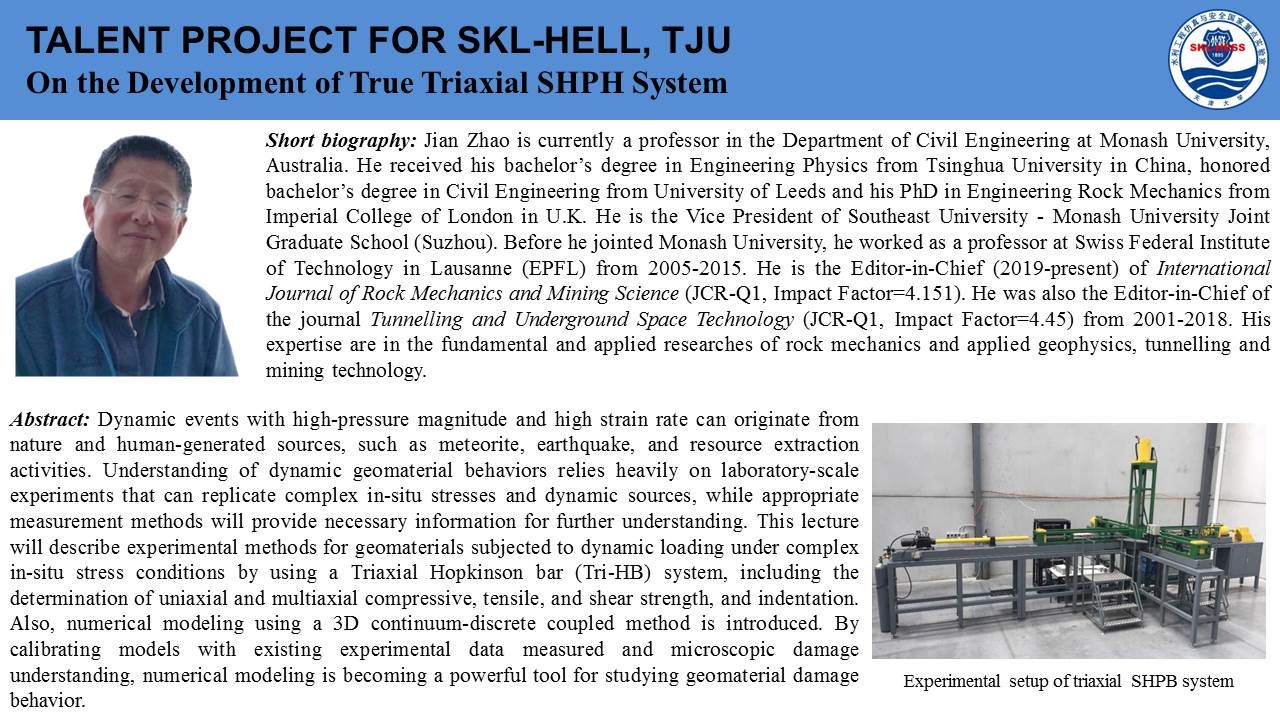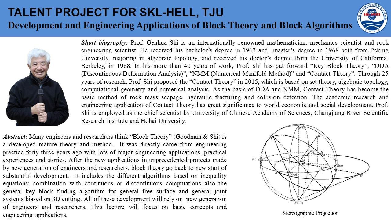 2020年7月18日上午,由国际岩石力学与岩石工程学会非连续变形分析专委会和岩石动力学专委会联合发起,beat365在线唯一官网、天津大学和东南大学联合承办的第一期国际岩石力学云论坛成功举行。本次论坛邀请了关键块体和数值流形理论创建者石根华教授、澳大利亚莫纳什大学赵坚教授、澳大利亚悉尼大学沈鲁明教授分别作了题为《Development and engineering applications of block theory and block algorithms》、《On the development of true triaxial SHBP system》、《A coarse-grained approach for modelling solid-liquid-gas interactions at microscale》的精彩讲座,来自莫纳什大学、悉尼大学、新加坡南洋理工大学、日本京都大学、beat365在线唯一官网、天津大学、东南大学、中山大学、大连理工大学、山东大学等全球各高校的1000余名专家学者参与了此次云论坛。