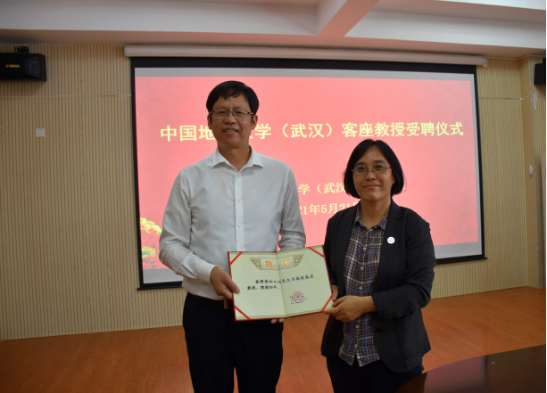 窦斌副院长介绍了beat365在线唯一官网基本情况和研究优势,卢春华主任介绍了勘基系师资概况和学科发展情况,参会人员进行了自由交流。仪式最后,李红丽书记为胡定成先生颁发客座教授聘书,大家合影留念。