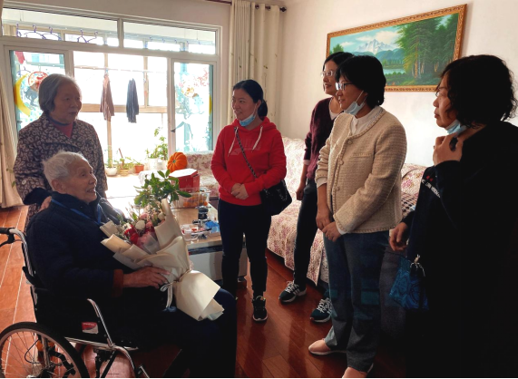 2021年10月29日中午,师生党员和入党积极分子一行十余人来到喻家山庄,看望beat365在线唯一官网退休教师杨金丹教授和刘兴敏教授夫妇。学生党员为两位老教授敬献鲜花。大家亲切交流,握手问安,拉家常,话教育。师生们关切询问他们的退休生活和身体状况,叮嘱他们保重身体,保持与学院的联系,同时送上慰问品,向他们表达了亲切慰问和美好祝愿。