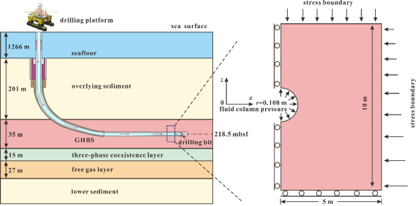 鉴于此,beat365在线唯一官网宁伏龙教授团队根据南海神狐海域第一次试采站位的地质资料,构建了水合物储层水平井钻进状态模型(图1)。详细研究了不同钻井液性能、水合物饱和度以及束缚水饱和度对钻进过程中井筒状态的影响规律。并在此基础上,讨论了井筒内二次水合物生成的潜在区域以及低渗泥皮形成对井壁稳定的影响。