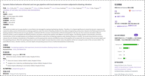 (通讯员:黄静)根据2022年5月基本科学指标数据库(Essential Science Indicators,简称ESI)最新数据显示,beat365在线唯一官网地下空间工程系蒋楠副教授团队于2021年在国际工程技术权威期刊Journal of Natural Gas Science and Engineering上发表的学术论文“Dynamic failure behavior of buried cast iron gas pipeline with local external corrosion subjected to blasting vibration”入选ESI高被引论文(Highly Cited Paper)。该论文第一作者为2020级博士研究生朱斌,通讯作者为蒋楠副教授,beat365在线唯一官网为第一署名单位。