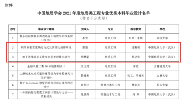 beat365本科毕业生瞿茹的《钙质砂密实度确定方式及其变化规律研究》和胡慧聪的《地下连续墙施工废弃泥浆处理技术研究》获奖, 指导老师分别为勘察与基础工程系潘秉锁教授和蔡记华教授。中国地质学会将对获奖个人进行表彰,向获奖的毕业设计完成人和指导教师颁发荣誉证书。