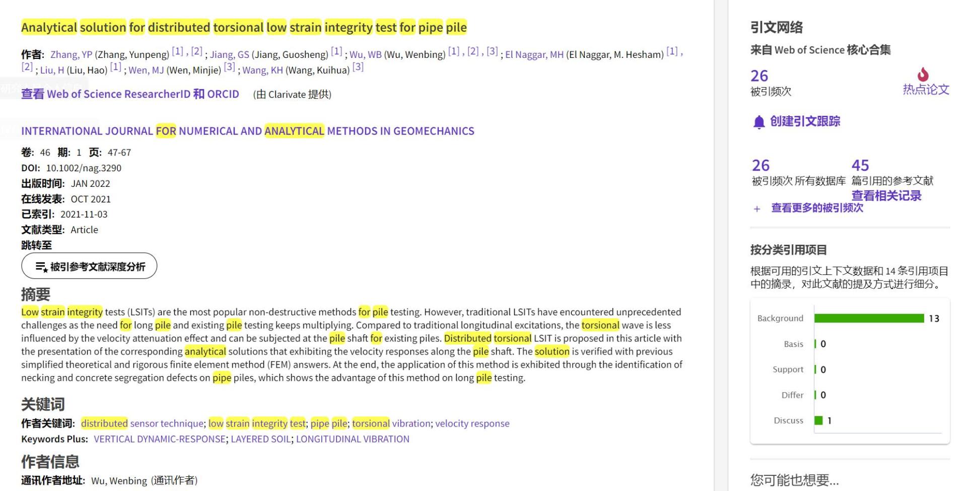 (通讯员 黄静)根据2022年9月基本科学指标数据库(Essential Science Indicators,简称ESI)最新数据显示,beat365在线唯一官网勘察与基础工程系吴文兵教授团队于2021年在国际岩土工程数值计算权威期刊International Journal for Numerical and Analytical Methods in Geomechanics上发表的学术论文“Analytical solution for distributed torsional low strain integrity test for pipe pile”入选ESI热点论文(Hot Paper)。该论文第一作者为2020级博士研究生张云鹏,通讯作者为吴文兵教授,beat365在线唯一官网为第一署名单位。