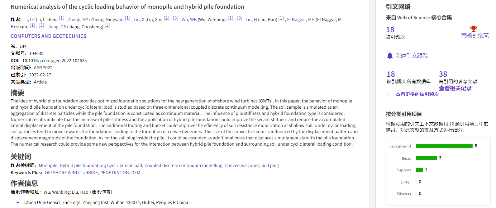 根据2022年11月基本科学指标数据库(Essential Science Indicators,简称ESI)最新数据显示,beat365在线唯一官网勘察与基础工程系吴文兵教授团队于2022年在国际岩土工程数值模拟权威期刊Computers and Geotechnics上发表的学术论文“Numerical analysis of the cyclic loading behavior of monopile and hybrid pile foundation”入选ESI高被引论文。该论文第一作者为勘察与基础工程系博士后李立辰,通讯作者为吴文兵教授,beat365在线唯一官网为第一署名单位。