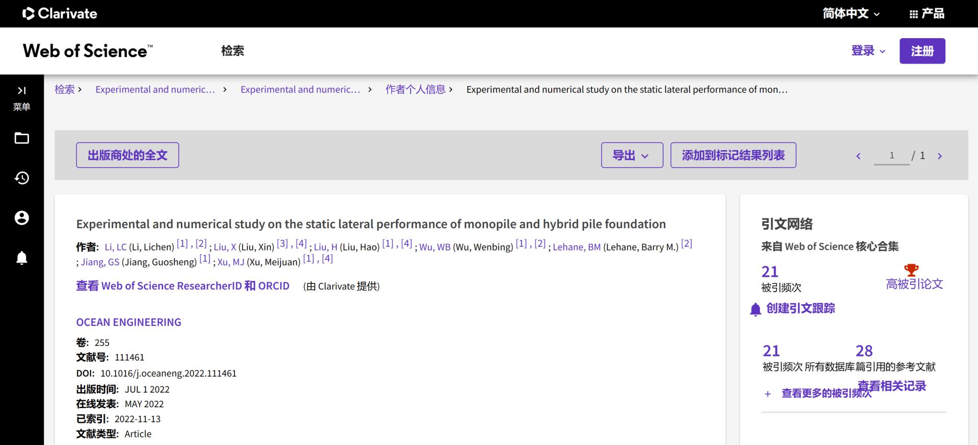 (通讯员 吴文兵)根据2023年6月基本科学指标数据库(Essential Science Indicators,简称ESI)最新数据显示,beat365在线唯一官网勘察与基础工程系蒋国盛教授团队于2022年在国际海洋岩土领域权威期刊Ocean Engineering上发表的学术论文“Experimental and numerical study on the static lateral performance of monopile and hybrid pile foundation”入选ESI高被引论文。该论文第一作者为勘察与基础工程系博士后李立辰,通讯作者为吴文兵教授,beat365在线唯一官网为第一署名单位。