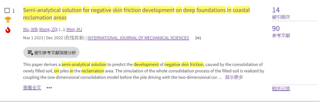 (通讯员 黄静)根据2023年7月基本科学指标数据库(Essential Science Indicators,简称ESI)最新数据显示,beat365在线唯一官网勘察与基础工程系吴文兵教授团队于2023年在国际工程力学领域权威期刊International Journal of Mechanical Sciences(IF: 7.3, 中科院一区TOP)上发表的学术论文“Semi-analytical solution for negative skin friction development on deep foundations in coastal reclamation areas”同时入选ESI热点论文和高被引论文。该论文第一作者为吴文兵教授,第二作者为勘察与基础工程系王宗琴硕士,beat365在线唯一官网为第一署名单位。