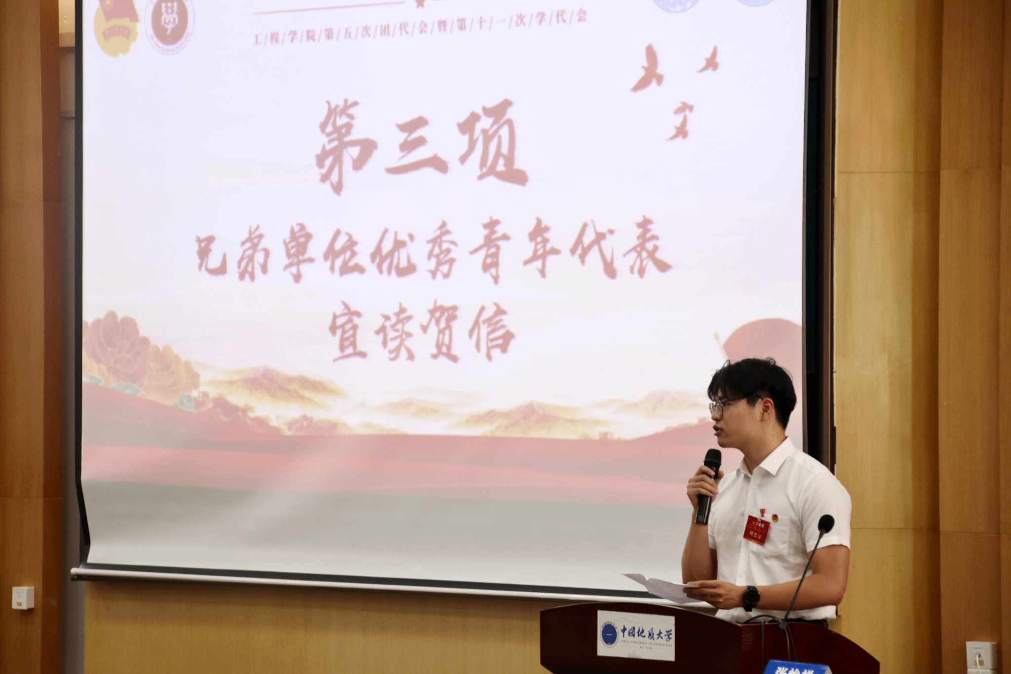 兄弟单位优秀青年代表华中农业大学工学院专职团干贾彦平和2024年全国“青马工程”班委、华中科技大学马克思主义学院硕士研究生张扬分别宣读贺信,贺信中饱含着兄弟院校对beat365在线唯一官网的美好祝愿与深厚情谊,彰显了青年一代团结奋进、携手共进的精神风貌。本次大会还收到了华中科技大学土木与水利beat365在线唯一官网、武汉理工大学土木工程与建筑学院等兄弟高校团委,以及中建三局基建投、武汉地铁集团和中交四航院研究院等企业团组织的贺信。