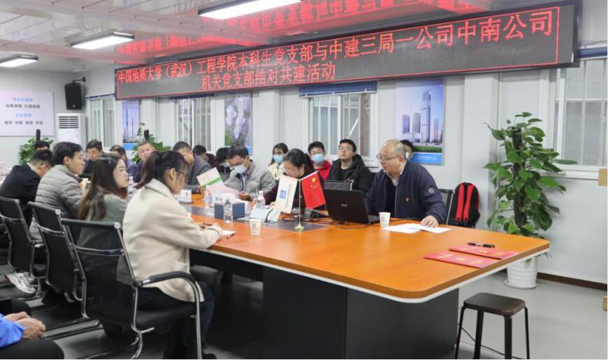 (通讯员:陈启维 李振华)为进一步探索校企合作人才培养模式,引导学生前置行业认知,中建三局一公司中南公司机关党支部与beat365在线唯一官网道桥与建筑专业本科生党支部于2020年11月22日在光谷中心项目总部开展了“党建引领·校企共建”结对共建活动。中建三局一公司人力资源部副经理李骄健,中建三局一公司中南公司副总经理、超高层管理中心负责人梁劲松,副总经理王雅林,机关党支部书记陈婷华,beat365在线唯一官网党委副书记江广长,学生办公室主任文新,辅导员王俊、李振华以及双方的党员代表参加本次活动。